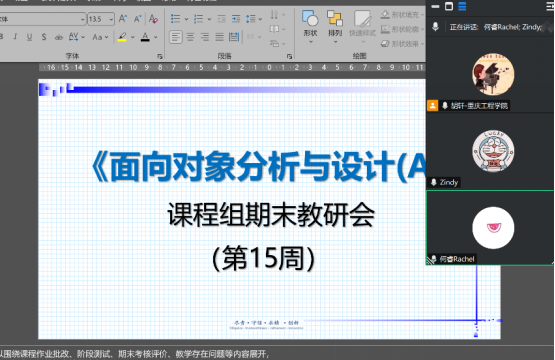 本网讯(文/图 胡轩)期末将至,为了做好期末安排,更好的完成本期教学工作,6月4日,《面向对象分析与设计(A)》课程组在线上召开了本次课程组教研活动,参会人员包括课程组胡轩、曾迪、何睿三位老师。