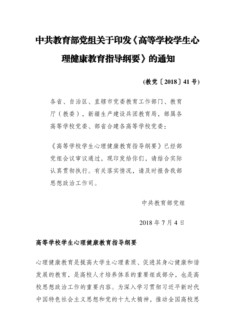 中共教育部党组关于印发《高等学校学生心理健康教育指导纲要》的通知