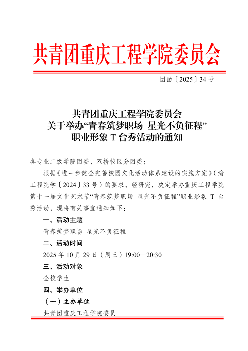 共青团重庆工程学院委员会关于举办“青春筑梦职场星光不负征程” 职业形象T台秀活动的通知