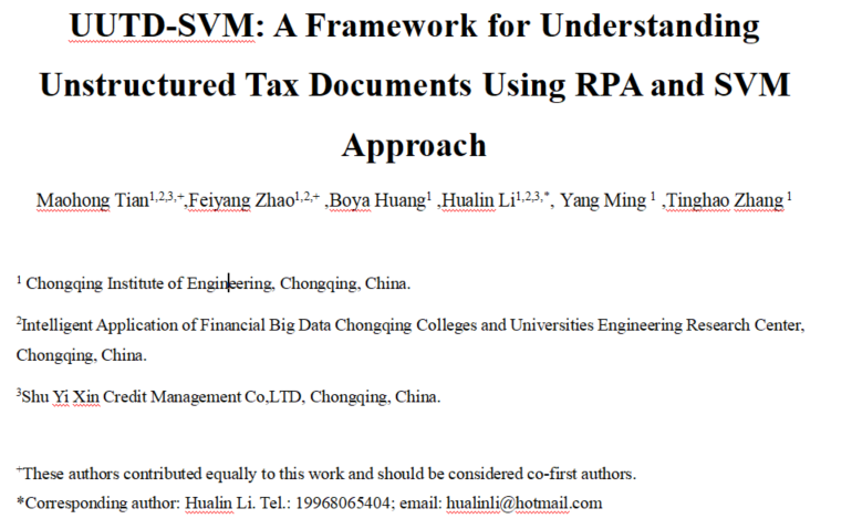 Abstract: With the development of the digital economy, a fully online method is used to obtain the customer's tax return-related text documents with the customer's authorization, and review the key information of the text documents. This business process relies heavily on labor, and the review of related written documents has become time consuming. In order to solve this problem, this paper proposes a fully intelligent document processing framework for tax return text files. This framework combines natural language processing (NLP) and Multi-SVM Classifiers based on traditional robotic process automation (RPA). Combined with a fully automatic parsing method, this method can realize the identification, classification and extraction of key text information of tax declaration text files, and provide corresponding query services to downstream users in the form of APIs. To further evaluate the effectiveness of this framework, extensive experimental verification was conducted on customer data of a financial institution. The SVM has the performance. Precision, Recall, and F1-value are 97.23%, 98.41%, and 96.42% respectively. The entire process takes less than 5 minutes for a single customer, and the precision rate is 98.12%, the results show that the framework has high commercial value and has basically reached commercial standards.