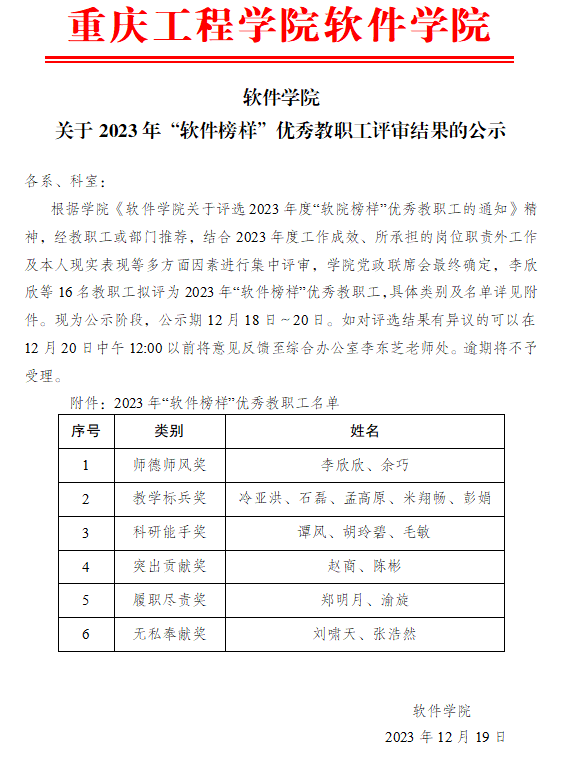软件学院关于2023年“软件榜样”优秀教职工评审结果的公示