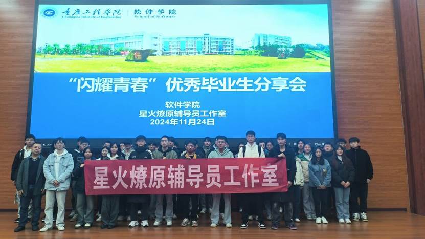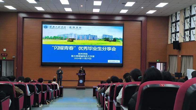 软件学院 冉丽清) “星火燎原”辅导员工作室于2024年11月24日16:00在第七教学楼7807举办了第八期“闪耀青春”优秀毕业生分享会。活动邀请了软件学院20届袁滢露、23届刘鸿松和24届潘文俊3位优秀校友回校分享,共吸引270余名学生参与。