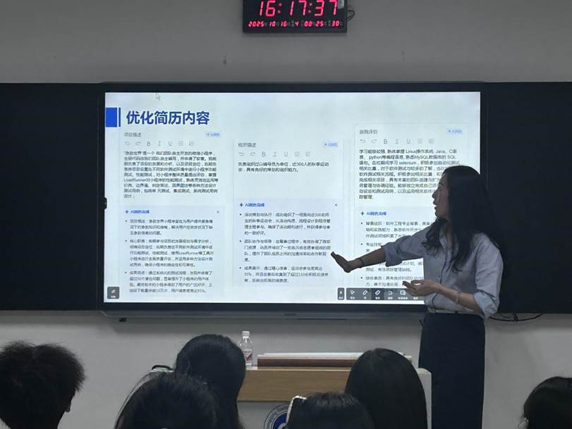 (图/ 软件学院 高一帆)为帮助学生应对就业市场竞争,解决求职过程中的各类难题,助力学生实现从校园到社会的顺利过渡,提升综合就业竞争力,星火燎原辅导员工作室于 2025 10 16 16:00,在南泉校区第六教学楼 6121 举办 “职引未来,扬帆起航” 专题讲座,软件学院全体同学(南泉校区)参与此次活动。