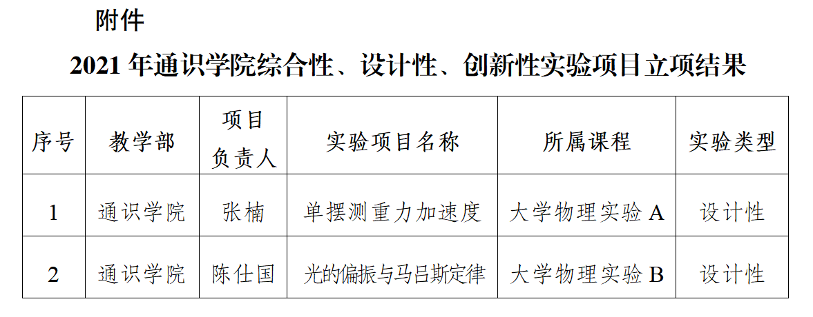 附件:2021年通识学院综合性、设计性、创新性实验项目立项结果