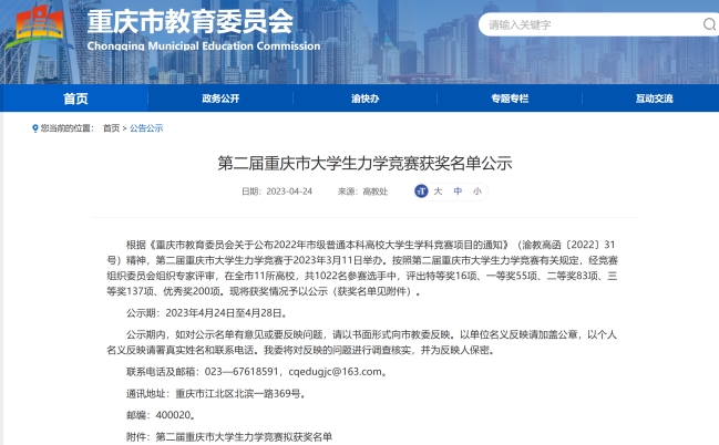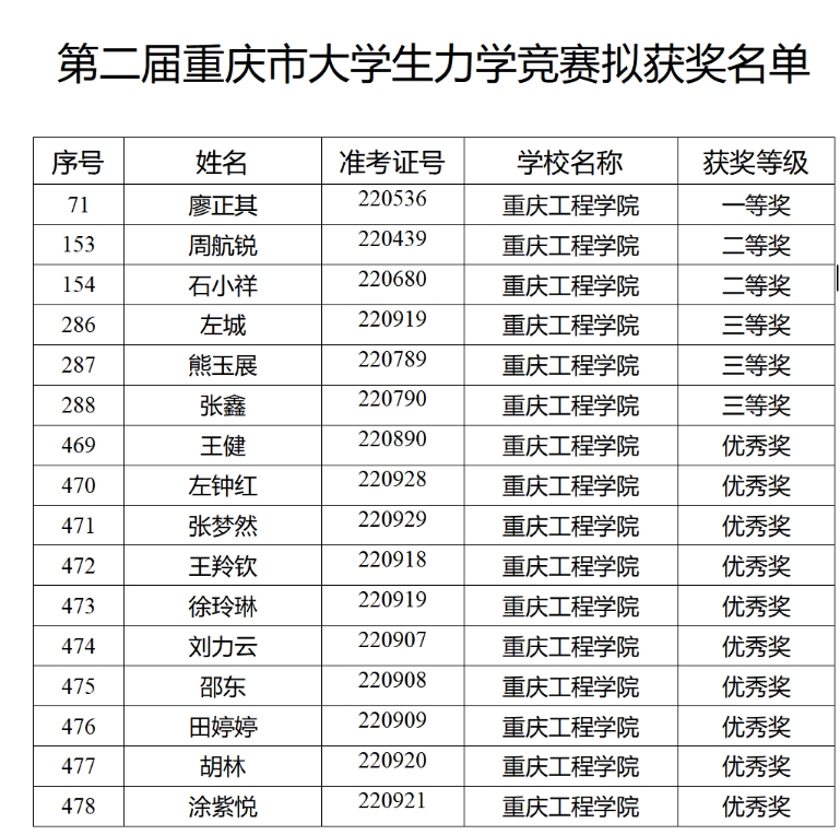 据悉,第二届重庆市大学生力学竞赛由重庆市教育委员会主办,重庆力学学会指导,重庆交通大学承办。全市共来自重庆大学、西南大学、重庆邮电大学等11所高校的1022名本科生、研究生和大中专生参赛,共评选出特等奖16项,一等奖55项,二等奖83项,三等奖137项,优秀奖200项。本赛事每两年举办一次,由重庆市教育委员会主办,重庆力学学会指导,旨在考察学生综合运用大学物理、理论力学和材料力学等课程的基础理论,建立力学模型和解决实际问题的能力。