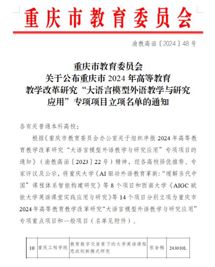 近日,重庆市教育委员会公布了2024年普通本科高校外语教育教学改革专项研究项目和2024年高等教育教学改革研究“大语言模型外语教学与研究应用”专项项目立项名单,我校2个项目获批立项。它们分别是基础学院蹇佳副教授主持的《基于人工智能用英语讲好中国故事的英语演讲能力提升研究》获批外语教育教学改革专项研究项目立项,张金梅副教授主持的《教育数字化背景下的大学英语课程思政创新模式研究》获批“大语言模型外语教学与研究应用”专项项目立项。