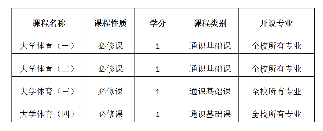 大学体育课程是大学生以身体练习为主要手段,通过合理的体育教育和科学的体育锻炼过程,达到增强体质、增进健康和提高体育素养为主要目标的公共必修课程。体育课程是学校课程体系的重要组成部分,是学校体育工作的中心环节,是实施素质教育和培养全面发展人才的重要途径。大一年级开设《大学体育(一)》 《大学体育(二)》,按自然班级组织教学,原则上固定任课教师和任课班级,以基本运动能力为主要内容,同时开展3个体育专项基础教学及体育理论教学,并组织学生参加体质测试(或12分钟跑)和重工乐跑。大二年级开设《大学体育(三)》 《大学体育(四)》,按体育专项方式组织教学,学生根据自己的兴趣爱好、体育特长自主选修,以专项运动技能为主要内容(每学期各选修1个体育专项),同时开展体育理论教学,并组织学生参加体质测试(或12分钟跑)和重工乐跑。体育教学将课程教学与体质测试、重工乐跑、体育社团活动、运动队竞训相结合,课程教学通过必修课、选修课方式开展,形成由体育必修课、体育选修课、国家体测+校园健身跑、体育俱乐部活动+学生运动队竞训构成的“1122”体育教学体系。