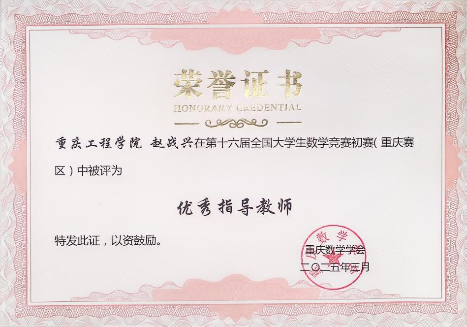 近日,2024年第十六届全国大学生数学竞赛(重庆赛区)结果公布,我校共有47名学生获奖。其中,一等奖6项,二等奖21项,三等奖20项。同时,赵战兴老师被重庆数学会评为重庆赛区“优秀指导教师”。