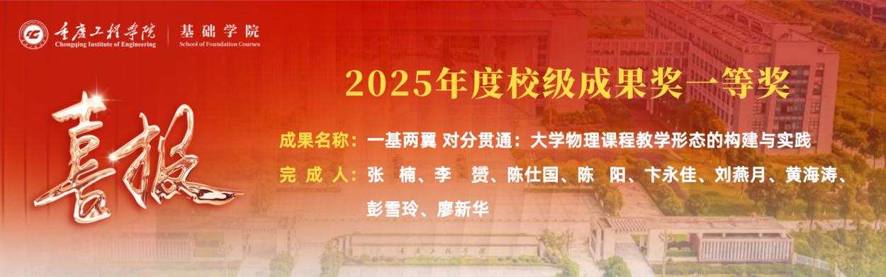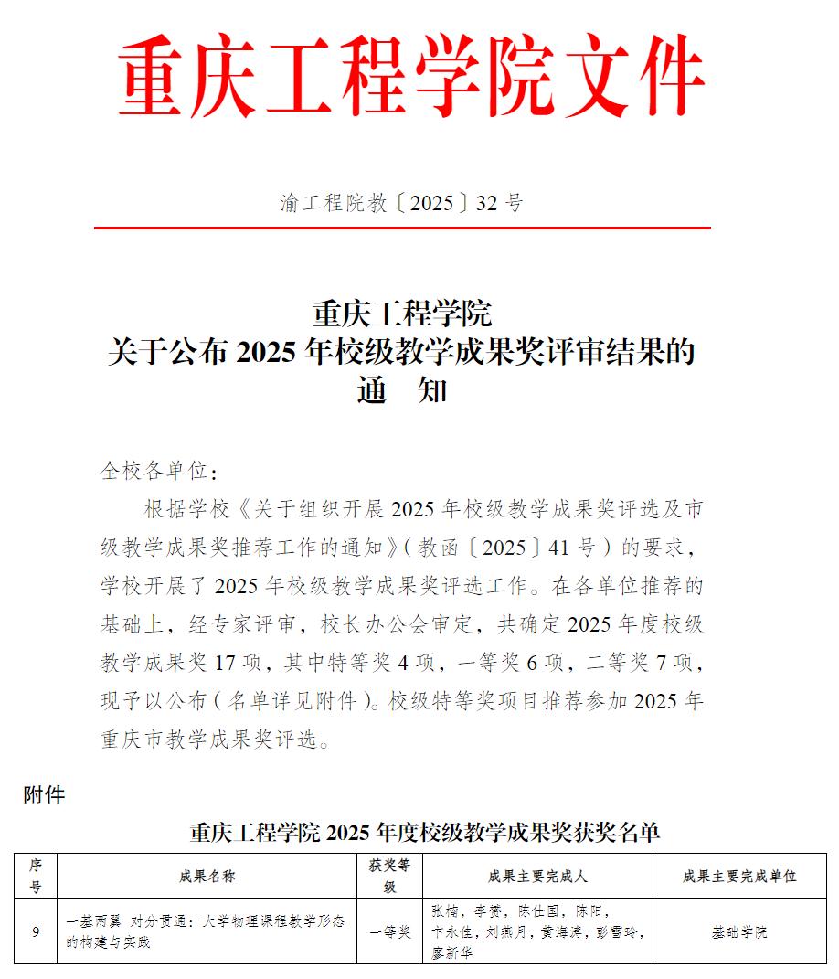 近日,学校公布了《重庆工程学院关于公布2025年校级教学成果奖评审结果的通知》(渝工程院教[2025]32号),公布2025年校级级教学成果奖获奖名单。我院物理教研室申报的《一基两翼 对分贯通:大学物理课程教学形态的构建与实践》荣获教学成果奖一等奖。