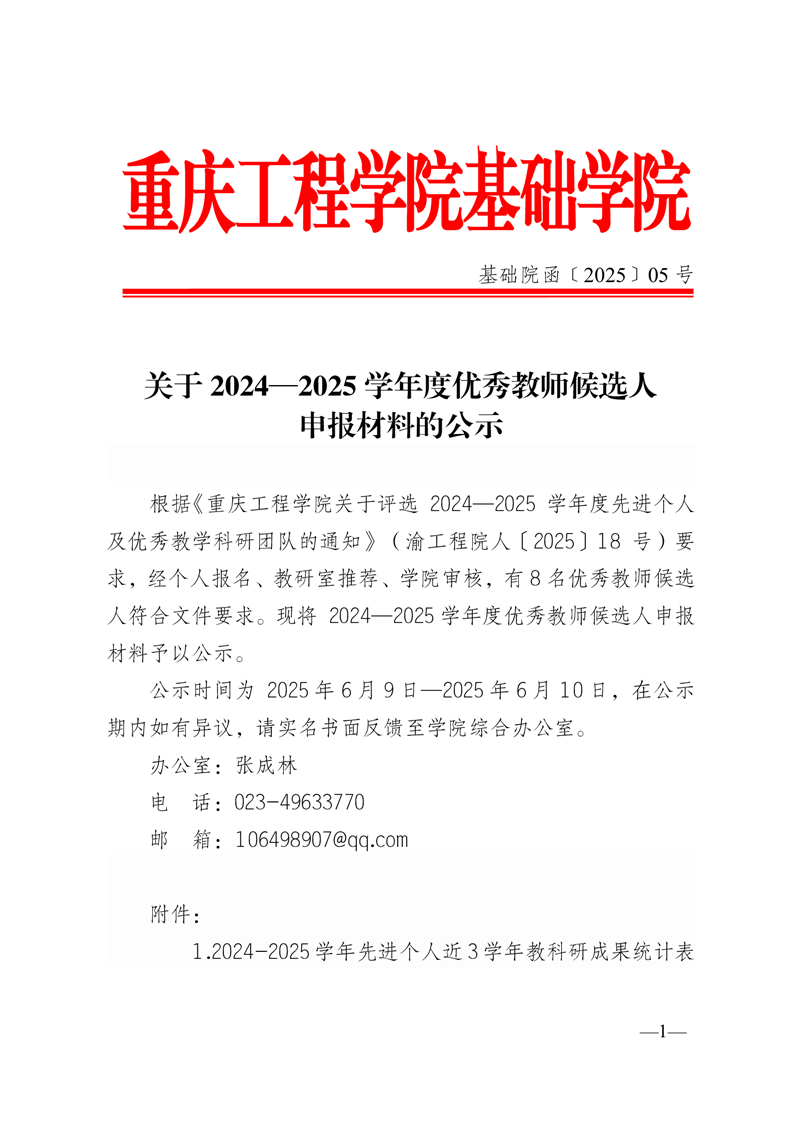 关于2024—2025学年度优秀教师候选人申报材料的公示